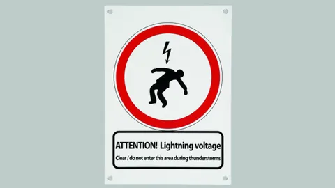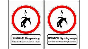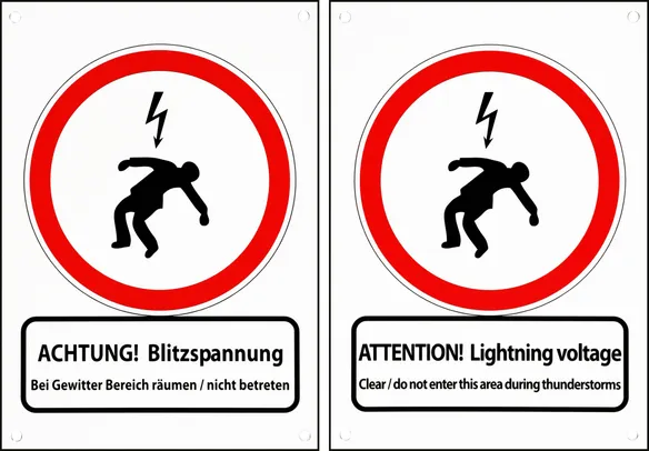 Tájékoztató tábla Figyelem villámfeszültség Tájékoztató tábla Rányomtatás az elülső oldalon németül: "ACHTUNG! Blitzspannung Bei Gewitter Bereich räumen / nicht betreten" Nyomtatás a hátoldalon angolul: "ATTENTION! Lightning voltage Clear / do not enter this area during thunderstorms"