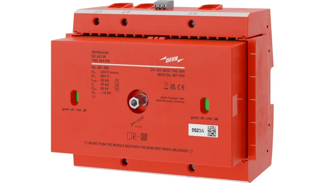 Hárompólusú kombinált levezető DEHNventil ACI M TNC, 1. típusú + 2. típusú + 3. típusú levezető az MSZ EN 61643-11 szerint szikraköz alapon integrált ACI kapcsoló-/szikraközzel. Magas rendelkezésre állás a RADAX Flow utánfolyóáram-korlátozás révén.