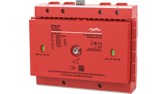 Négypólusú kombinált levezető DEHNventil ACI M TNS, 1. típusú + 2. típusú + 3. típusú levezető az MSZ EN 61643-11 szerint szikraköz alapon integrált ACI kapcsoló-, szikraközzel. Magas rendelkezésre állás a RADAX Flow utánfolyóáram-korlátozás révén.