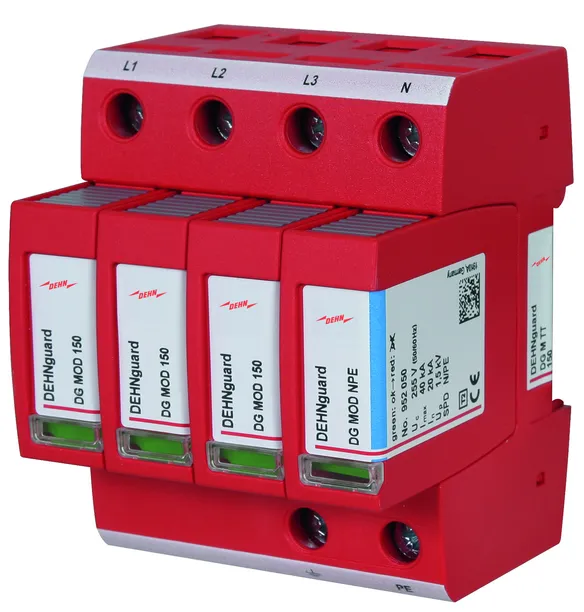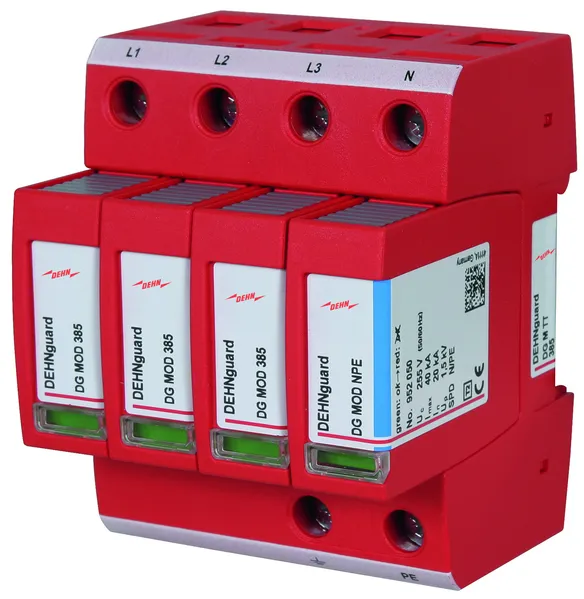 Modular surge arrester with a high total discharge capacity in the N-PE path for TT and TN-S systems (3+1 configuration). Meets the stricter safety requirements as outlined in DIN VDE 0100-534 for use at the feeding point of the electrical installation; with floating remote signalling contact.