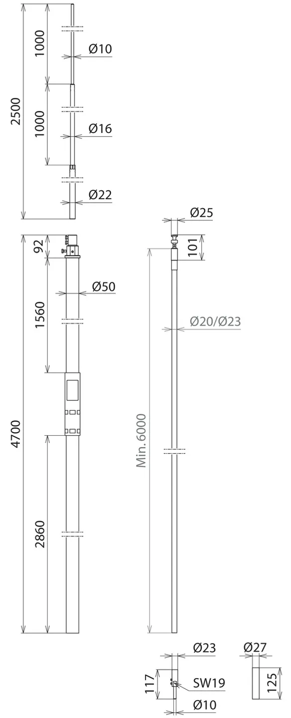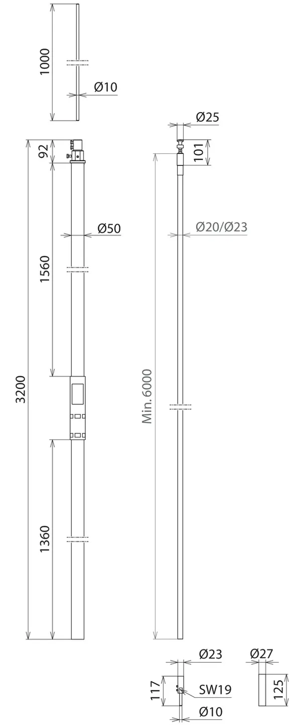 | Maximális szabad hossz felfogórúddal (fali szerelés) | 5000 mm |