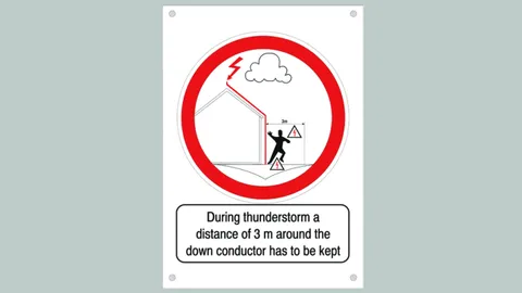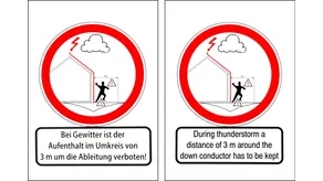 Elülső oldal Magyar:"Zivatar idején tilos a levezetés 3 méteres körzetében tartózkodni!"Hátoldal Angol:"During thunderstorm a distance of 3 m around the down conductor has to be kept!"
