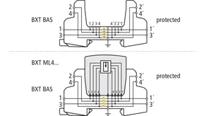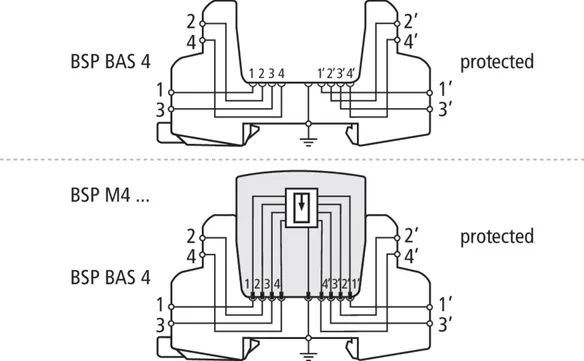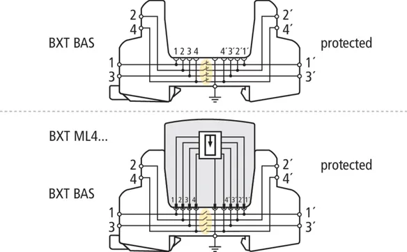 A BLITZDUCTOR XT alapmodulja egy nagyon helytakarékos és univerzális négypólusú átviteli egység mely nem szakítja meg az áramkört amennyiben a dugaszolható védelmi modult eltávolítjuk. Az aljzat a készülék talpán keresztül, kalapsínről kapja a földelést. Mivelhogy az alapmodulban nincs védelmi áramkör, a karbantartást a védelmi modulok cseréjével lehet elvégezni.