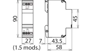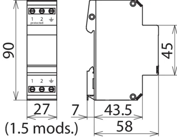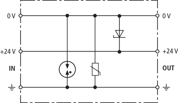Energetikailag koordinált kombinált levezető az egyenirányító védelmére a védőáramkörben (piros színű). Dugaszolható távjelző érintkező (nyitó) túlterhelés-kijelzés számára (varisztorok hőfelügyelete). Beszerelés acéllemezházba ajánlott. A kapacitív vezérlés következtében alacsony impulzus-megszólalási feszültség érhető el.
