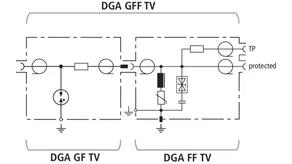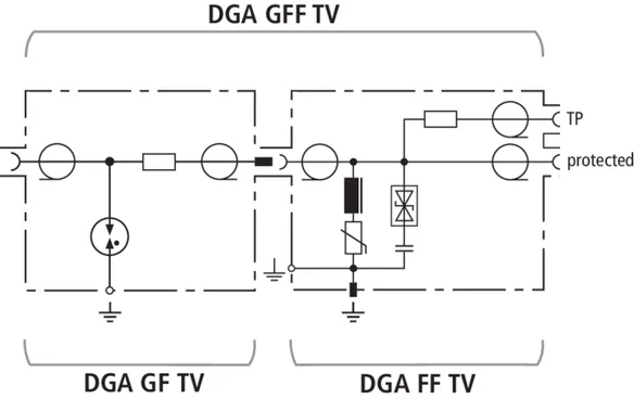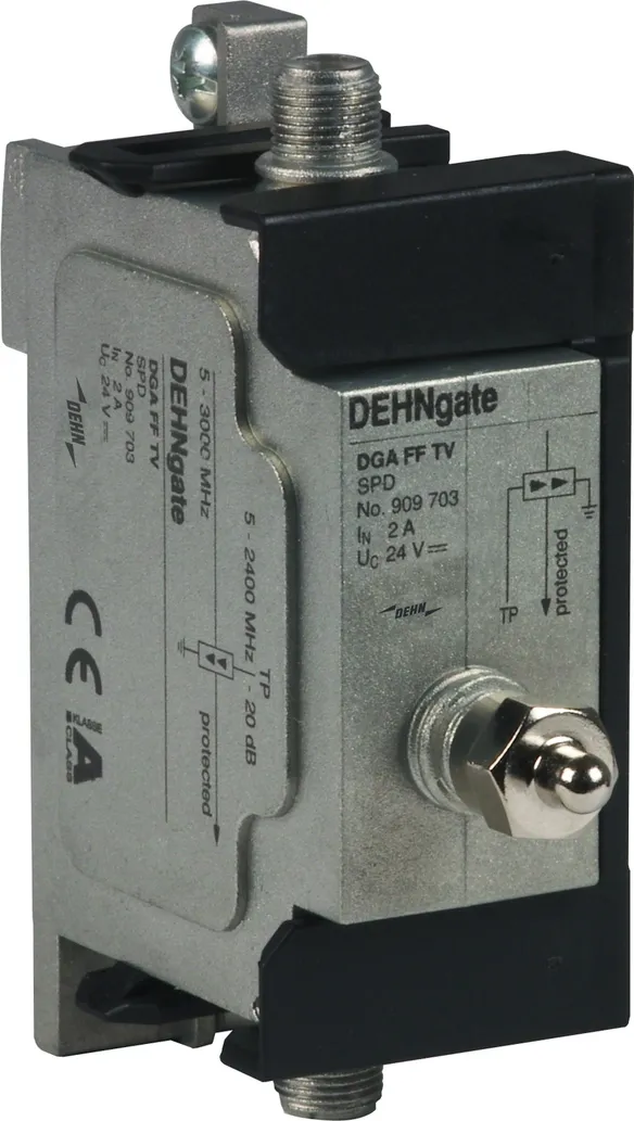 DGA ... TV távtáplálásra alkalmas levezetők F-csatlakozóval 75 Ohm-os SAT- és kábelrendszerekhez. A levezetők megfelelnek az A osztály megnövelt árnyékolási követelményeinek az EN 50083-2 szerint. A helytakarékos telepítésre alkalmasan az összes szokásos TV- és SAT-alkalmazáshoz elérhetők a levezetők villámáram-levezetőként, valamint túlfeszültség-korlátozóként vagy kombinált levezetőkészletként integrált méréskimenettel a rendszerfelülvizsgálat számára.