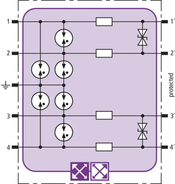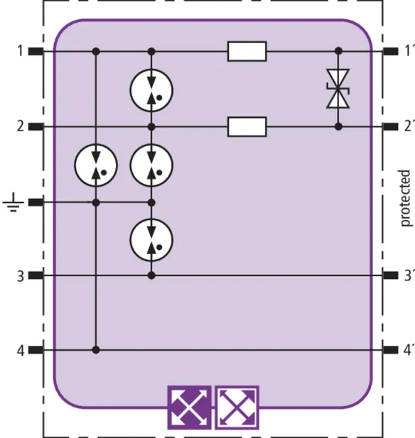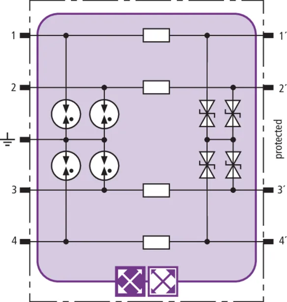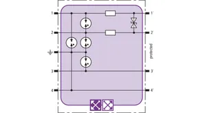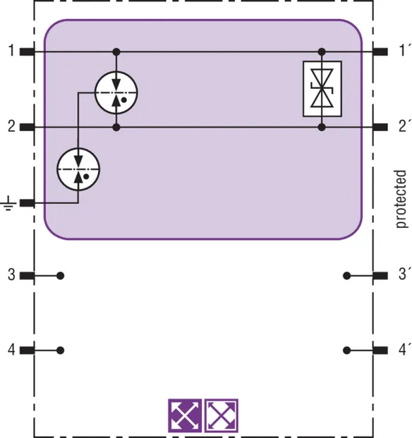 Helytakarékos túlfeszültség-védőmodul RFID-LifeCheck-kel 1 érpár védelmére gyújtószikramentes mérőáramköröknél és buszrendszereknél, választhatóan közvetlen vagy közvetett árnyékolásföldeléssel. Szigetelési szilárdság > 500 V ér-föld.