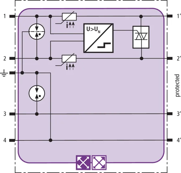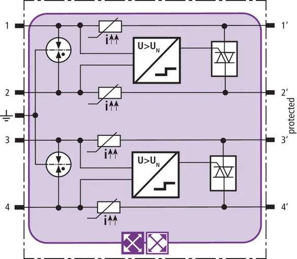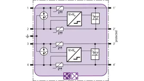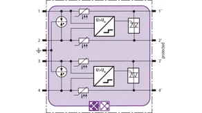 Helytakarékos kombinált védőmodul actiVsense-technológiával és RFID-LifeCheck-kel azonos vagy akár eltérő üzemi feszültségű 2 érpár védelmére szimmetrikus interfészekkel, galvanikus leválasztással. Felismeri automatikusan a hasznos jel alkalmazott üzemi feszültségét és a védelmi szintet optimálisan ehhez illeszti.