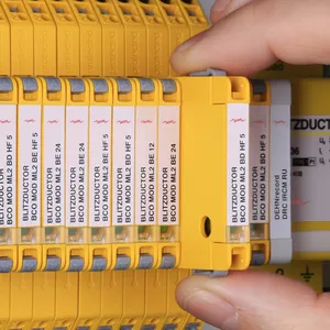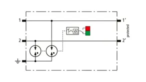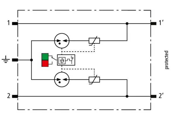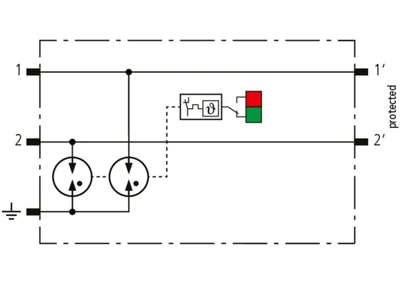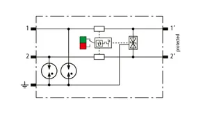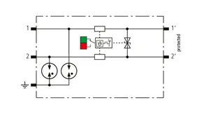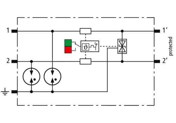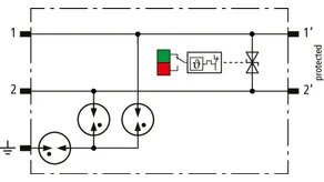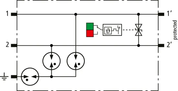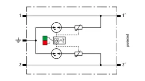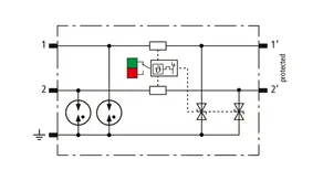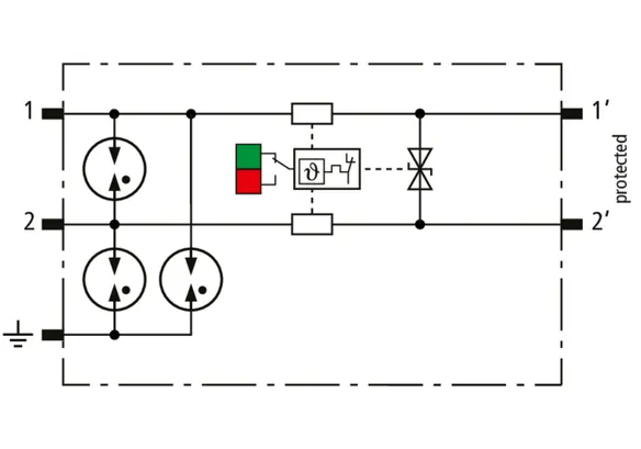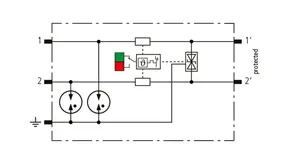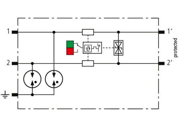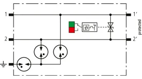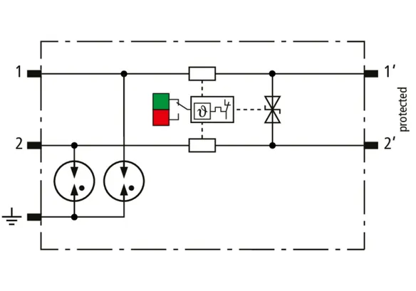 Helytakarékos, moduláris kombinált levezető 6 mm-es szélességgel, rugós csatlakozástechnikával, állapotjelzéssel 1 érpár védelmére 24 V DC rendszerekben. Alkalmazás földelt mínuszpólus esetén is, integrált PTC-ellenállások teszik lehetővé a levezető biztonságos visszaállítását zavarbefolyásolás után a berendezéskörben 40 A-ig terjedő rövidzárlati áramok esetén. Jelleválasztással karbantartási célra.