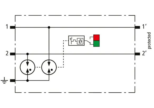 Helytakarékos, moduláris, 6 mm szélességű villámáram-levezető rugós csatlakozástechnikával, állapotjelzéssel, két egyedi ér védelmére villámvédelmi potenciálkiegyenlítéshez, valamint árnyékolt kábelek árnyékolásának közvetett földelésére. Jelmegszakítással karbantartási célokra.