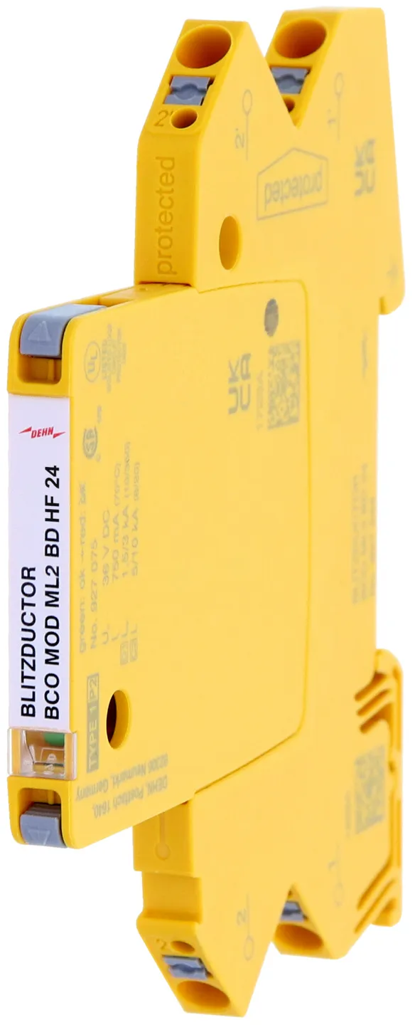 Helytakarékos, moduláris túlfeszültség-korlátozó 6 mm-es szélességgel és push-in csatlakozástechnikával, állapotjelzéssel többeres, földpotenciálmentes, 230 V névleges feszültségű jelinterfészek 2 érpárja védelmére. Jelleválasztással karbantartási célra.