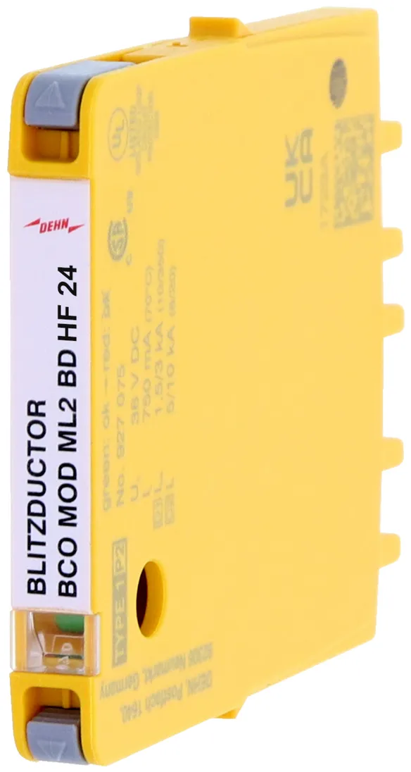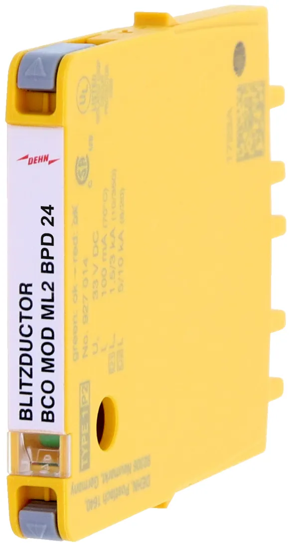 Kombinált levezető védőmodul 6 mm-es szélességgel BLITZDUCTORconnect számára állapotjelzéssel 1 érpár védelmére 24 V DC rendszerekben. Földelt mínuszpólus esetén is alkalmazható. Integrált PTC-ellenállások teszik lehetővé a levezető biztonságos visszaállítását zavarbefolyásolás után a berendezéskörben 40 A-ig terjedő rövidzárlati áramok esetén.