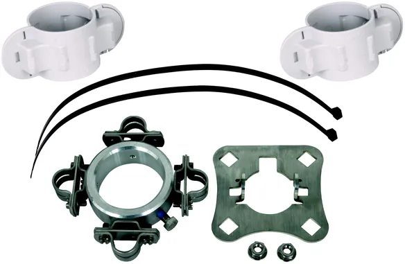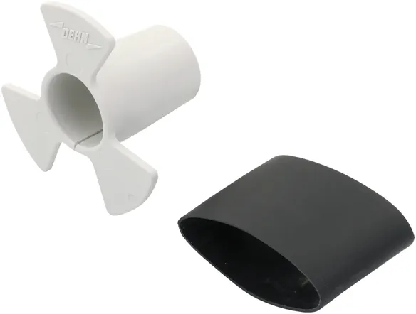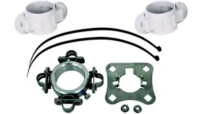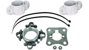 Rögzítőkészlet a HVI long vezeték szereléséhez HVI long tartócsövön, részei csatlakozólemez (négyes, két zárófoganyával) és rögzítőgyűrű négy hasított vezetéktartóval (Ø20 mm) a végelzáró számára (két kábelkötözővel együtt, műanyag tartó felekkel).