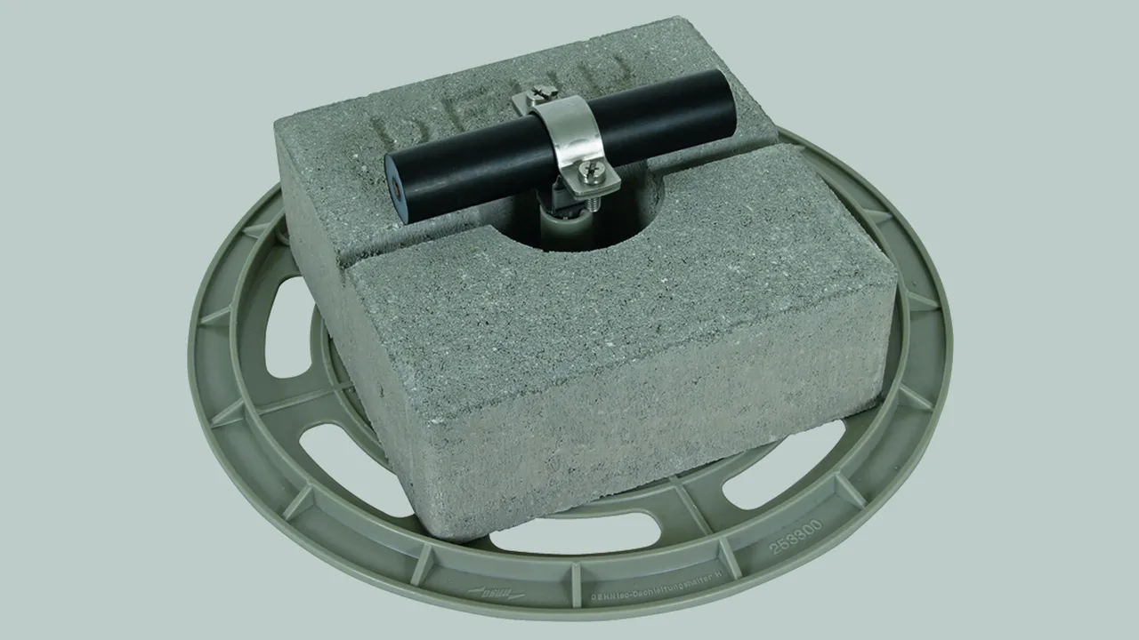 Betontalp éktechnikával Betontalp éktechnikával Összsúly: 8,5 kg kisebb tetőszerkezetek védelmére lapostetőn, felfogócsúccsal, hosszúság 1m pl. (cikkszám 101 001) vagy távtartók kivitelezésére a DEHNiso távtartó programból pl. külön körvezetékekhez