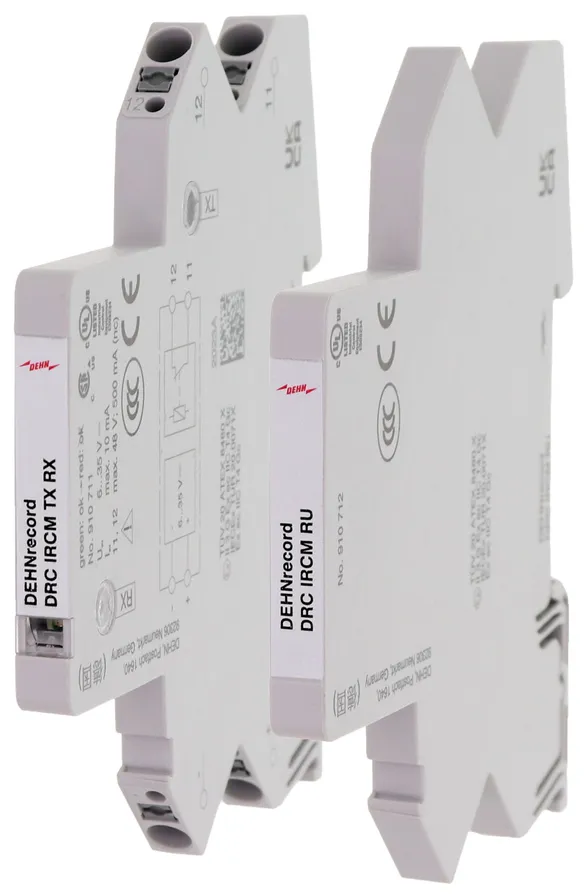 Állapotfigyelő egység DEHNrecord, DIN-sínes eszközkészlet beépített optikai adóval/vevővel és optikai eltérítő egységgel a BLITZDUCTORconnect és DEHNpatch levezetők állapotorientált felügyeletéhez LifeCheck-kel. Optikai állapotjelzés LED-gyújtőkijelzéssel és távjelző érintkezővel (nyitóérintkező) kombinálva.