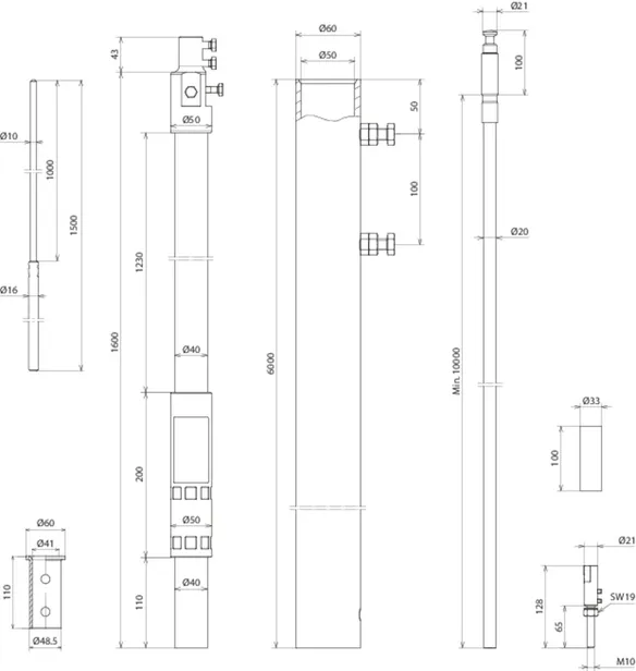 Az osztható felfogórúd / készlet részei: – felfogórúd Al, Ø16/10 mm, hossza 1500 mm – tartócső GFK/Al Ø40/50 mm, hossza 1600 mm – adapter St/tZn, Ø40/50 mm – árboccső St/tZn, Ø60 mm, hossza 6000 mm (max. szállítási hossz) – HVI light plus vezeték (előszerelt, csövön belüli fektetéshez)